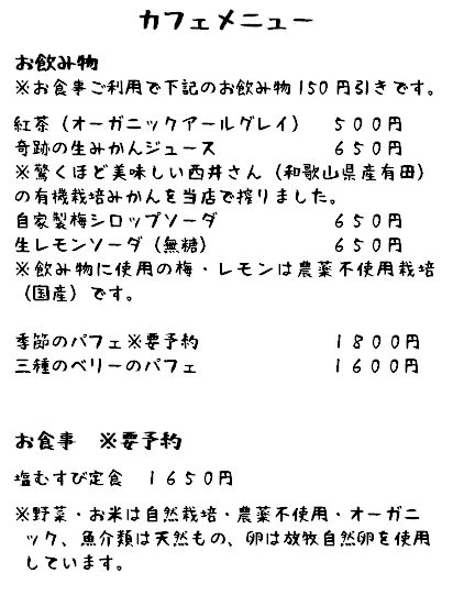 ![]() 農薬不使用栽培・雪室熟成米の塩むすび定食 (おかずはその日によって変わります) 季節のパフェ(写真はタルトタタンパフェ) |