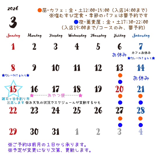 | 営業案内 蕎麦 カゼトソラ *********** 当店は、予約制です。2日前までの予約を お願いしておりますが、前日・当日でもお席のご用意が できる場合がありますので、 お問い合わせください。 ※当日は電話(0363153224)でお願いいたします。 蕎麦屋のお品書きはこちらから 営業日 金曜日・土曜日 ※貸切は通常営業日に関わらず、ご相談ください。 営業時間 17時30分開店(入店19時まで) 21時30分ラストオーダー カゼトソラ カフェ部 営業日 金曜日・土曜日 営業時間 12時開店(入店14時まで)15時閉店 カフェのメニューはこちら 塩むすび定食は要予約です。 来店時間の2時間くらい前に 連絡をいただければ、ご用意できる 場合があります。 ○全席禁煙です○ お煙草は玄関外でお願いいたします。 ○カードでのお支払いはできません。現金のみです。○ ***** ![]() ![]() お子さまとお越しになられるお客さまへ →ご一読ください← 別のページが開きます ○ご予約について○ ご予約は来店の一か月前から受け付けます。 メールか電話でお願い致します。 希望日時とお名前、 予約決定時に携帯番号もお知らせください。 当日でもお席のご用意ができる場合もございます。 前日まではメールか電話、当日は電話でお問い合わせください。 men-yu@ok.peewee.jp メールはできるだけ当日中に返事をしております。 一両日中に返事がない場合は届いてない可能性が ありますので、電話でお問い合わせください。 携帯電話のアドレスからいただいたメールに返信すると、 エラーになることがあります。 電話番号 03-6315-3224 〒133-0057 江戸川区西小岩3-27-12 ◎当店のメルマガ「カゼトソラだより」◎ 不定期にメルマガをお送りしております。 お菓子の情報(カゼトソラオーガニックベイク)が ほとんどですが、 たまに季節のお便りやイベント情報などなど。 ↓ お申し込みはこちらからどうぞ。 |
